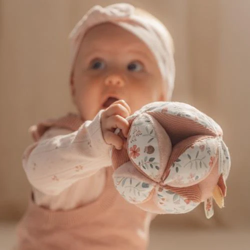 Essayez d’attraper la balle ! Cette balle d’attrape avec sa forme intéressante offre un défi formidable pour votre petit. Les surfaces de différentes textures et motifs invitent à saisir et à explorer. La balle est facile à attraper pour les petites mains et le joyeux son de la clochette qui tinte récompense l’effort de votre bébé. Sur le beau décor de Fairy Garden, les différentes étiquettes amusantes faciles à saisir stimuleront les sens, développeront la prise et occuperont bien votre bébé dans le parc.