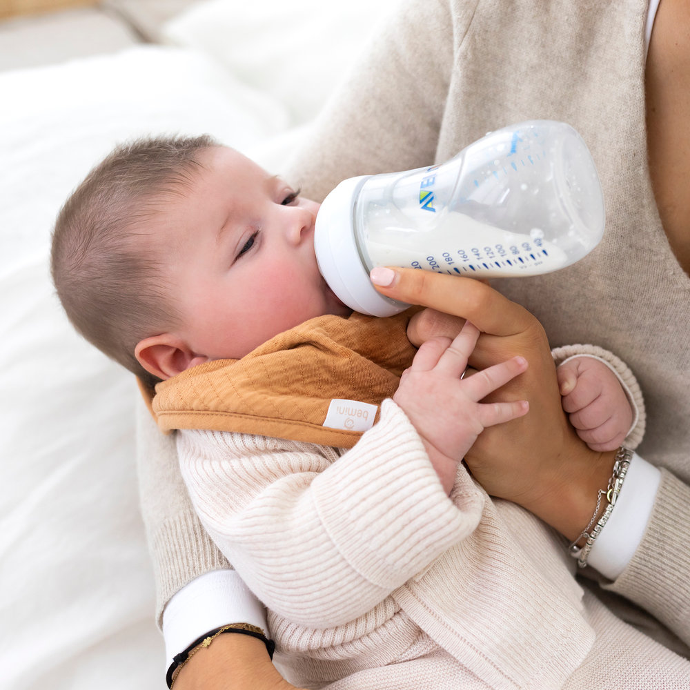 Grâce à sa pellicule imperméable intérieure, il protège le cou et les tenues de bébé.