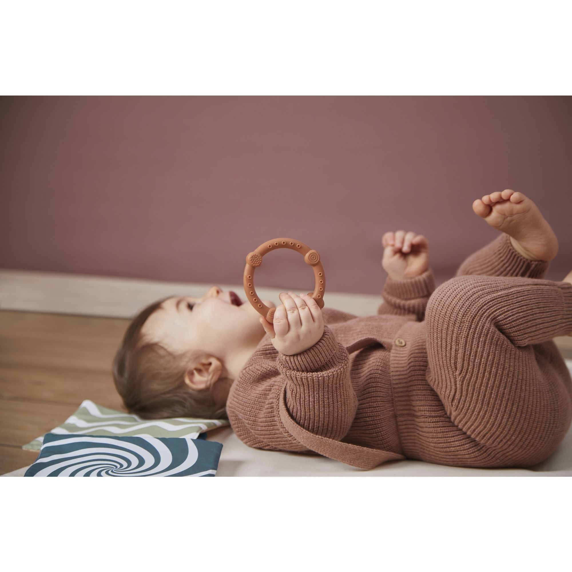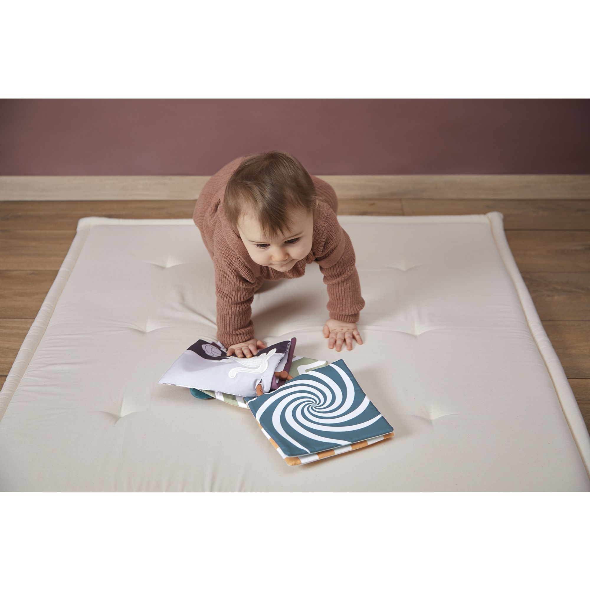 De plus, 6 textures variées sont à découvrir du bout des doigts (micro-velours, velours côtelé, suédine, tissu bouclé, mousseline de coton, feutrine) : ce ne sont donc pas uniquement des cartes de stimulation visuelle, mais un jouet parfait pour développer le sens du toucher du tout-petit. Elles attisent sa curiosité, car elles sont pensées spécialement pour lui. Reliées entre elles par un anneau en silicone, elles peuvent être présentées à bébé tel un livre d’éveil en tissu, mais aussi disposées au sol pour encourager son exploration.