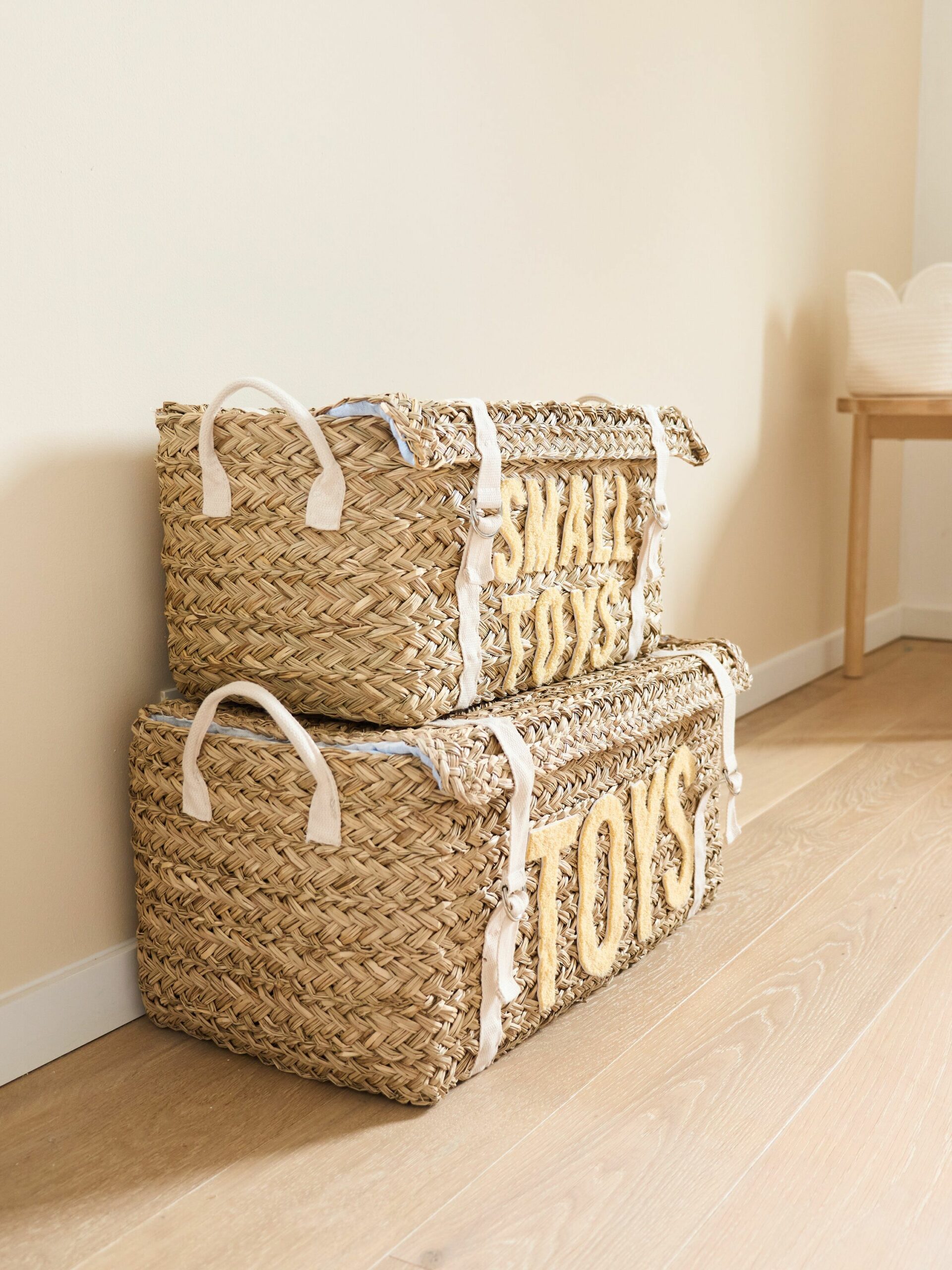 Ce set de deux magnifiques paniers en rotin est parfait pour ranger les jouets de votre enfant. Le grand panier porte l’inscription « TOYS » en lettres jaunes brodées et le petit « SMALL TOYS ». Les ceintures sont blanc cassé et l’intérieur est recouvert d’une doublure à rayures bleues. Ce design amusant s’intègre parfaitement dans tous les intérieurs. Ces paniers sont parfaits pour décorer la chambre de votre enfant ou pour ranger des jouets ou d’autres objets dans votre salon.