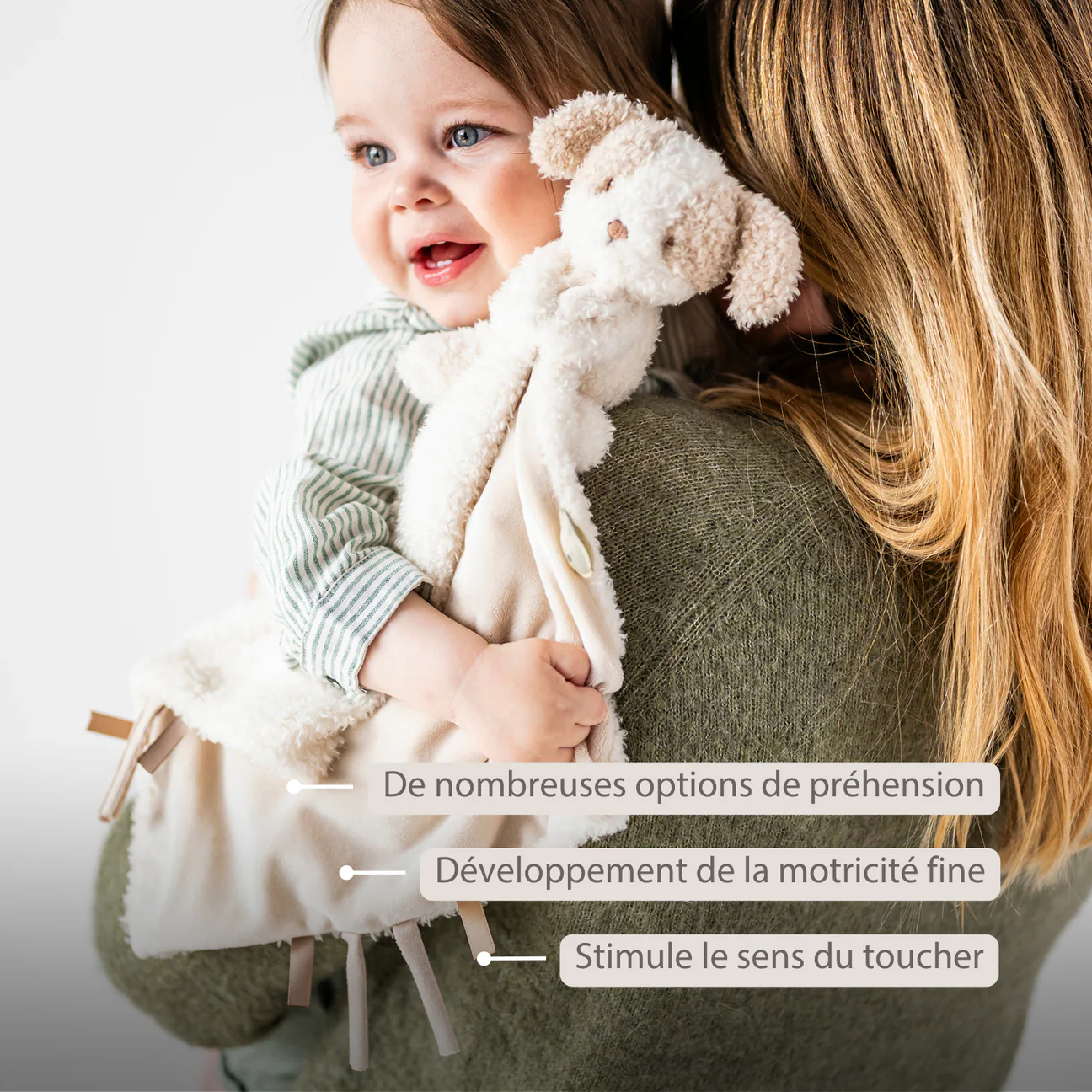 Ce doudou avec peluche chien de Nattou devient le compagnon inséparable de votre bébé dès la naissance. Le tissu doux procure réconfort et sécurité, tandis que la peluche de 15 cm offre une meilleure prise pour les petites mains. Grâce au tissu ultra doux et aux multiples possibilités de préhension, ce doudou est idéal pour les nouveau-nés et les prématurés. Un compagnon attendrissant offrant confort et amusement, parfait comme cadeau de naissance.