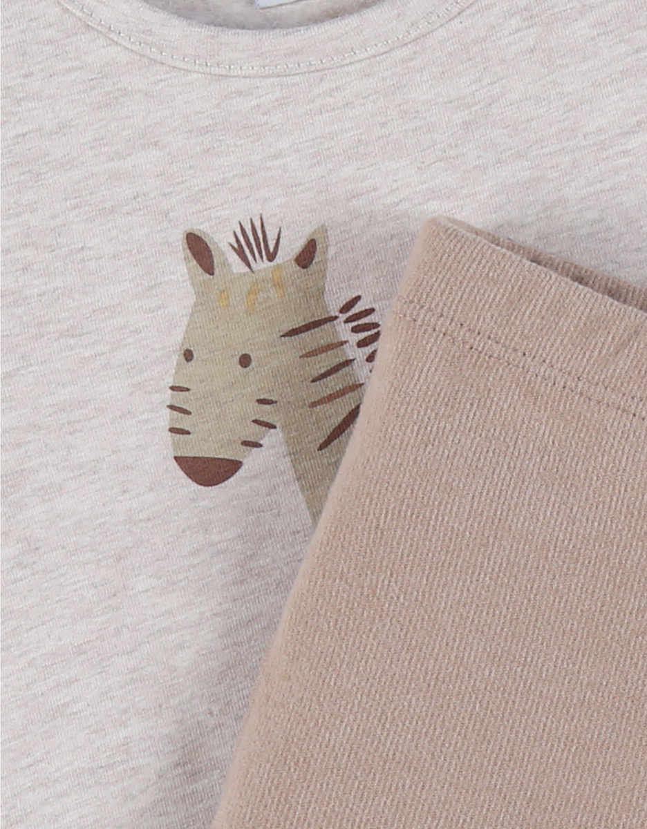Il se compose d’un t-shirt beige chiné à manches longues, orné d’un imprimé zèbre plein de tendresse, et d’un pantalon assorti en jersey côtelé beige ultra-extensible.