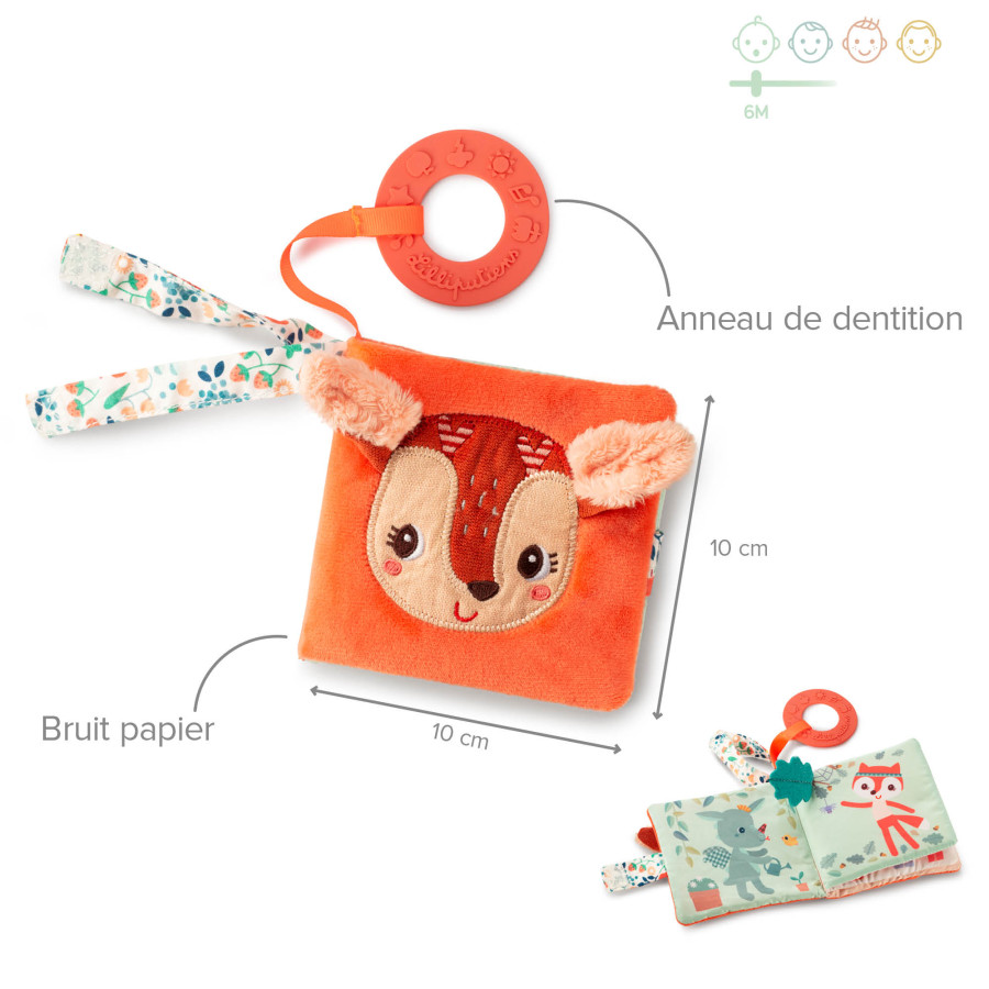 Le premier imagier tout doux de bébé ! En compagnie de Stella le faon, votre tout-petit découvre ses premières histoires, dès l’âge de 6 mois. Ce petit livre pour bébé au format 10 x 10 cm a été spécialement pensé pour être manipulé par les petites mains potelées. Au fil des pages de ce livre en tissu, Stella vous emmène dans les bois pour faire connaissance avec ses petits amis. Tiens, ne serait-ce pas Joe le dragon qui arrose les plantes ? Et qui se cache sous cette feuille en feutrine ? Oh, bonjour Alice la renarde ! En plus des illustrations poétiques à observer, des petites surprises sont à découvrir du bout des doigts. Votre enfant développe alors son acuité visuelle et sa motricité fine, tout en profitant de l’histoire : un vrai bain de langage ! Les matières variées que propose cet imagier permettent de stimuler le sens du toucher : regardez comme les oreilles de Stella sont douces ! Et pour attiser la curiosité de bébé et favoriser son éveil aux sons, la couverture du livre contient du papier bruissant à faire crépiter. Le petit plus de cet imagier Lilliputiens, c’est l’anneau de dentition rose qui lui est accroché. C’est idéal pour soulager les gencives douloureuses quand les dents commencent à faire leur apparition ! Vous pouvez suspendre le premier imagier de bébé à l’aide du ruban avec attache scratch, pour toujours l’avoir à portée de main. Partagez dès maintenant votre première histoire en famille ! Vous pouvez laver ce livre d’images en tissu en machine à 30°.