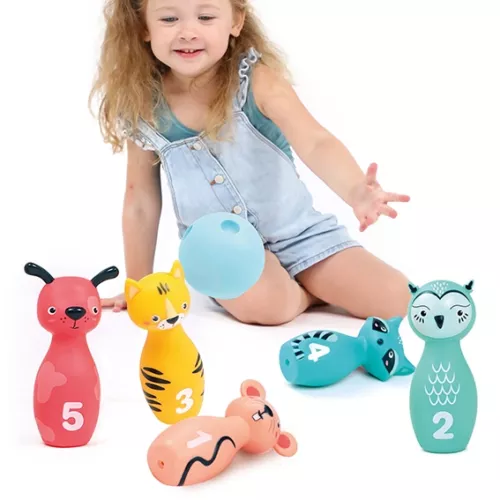 Ce jeu de quilles souples composé de cinq quilles animales et d’une balle ergonomique accompagne les enfants dès 10 mois dans le développement de la motricité, de la dextérité et de la coordination.