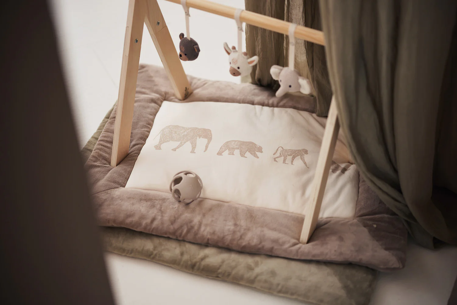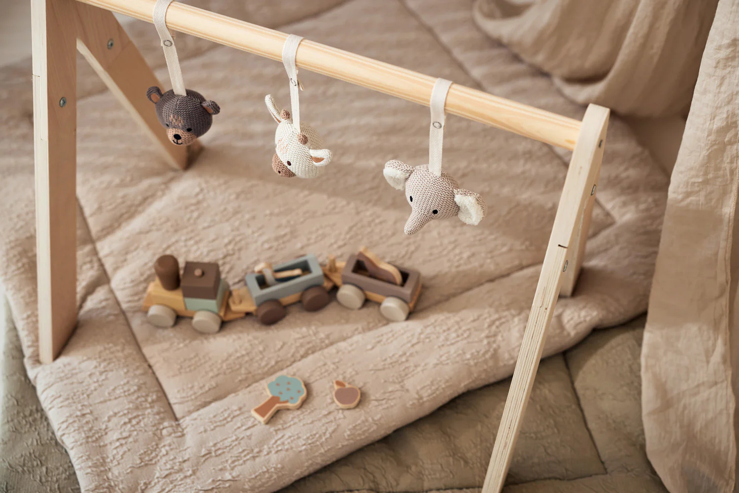 Dès l’âge de 10 semaines, votre bébé a davantage besoin d’être stimulé, de jouer et de regarder autour de lui. C’est là que l’arche d’éveil lui offre un défi supplémentaire. Installez bientôt l’arche d’éveil en bois dans votre maison et décorez-la avec ces amusantes figurines sur le thème des animaux. Ces joyeux jouets présentent les formes d’un éléphant, d’un ours et d’une girafe. Placez votre bébé sous ces jouets sur une surface douce et le jeu peut commencer ! Votre bébé sera fasciné par les mouvements des jouets sur l’arche d’éveil pour bébés. Il battra des pieds avec enthousiasme ou émettra des sons lorsqu’il parviendra à attraper un jouet ou à le tapoter pour le faire bouger davantage. L’utilisation d’une arche d’éveil stimule le développement de la motricité globale et de la motricité fine. Bref, elle stimule tous les sens. De plus, votre bébé maîtrise de mieux en mieux ses techniques de préhension et apprend que les jouets bougent davantage lorsqu’on les tape ou qu’on les attrape. Une telle arche d’éveil est donc très précieuse. Les jouets de l’arche d’éveil Jollein ne comprennent pas l’arche d’éveil en bois. Celle-ci est vendue séparément et est facile à assembler. Dans la collection Jollein, il existe différents jouets pour arche d’éveil assortis. Ces petits jouets s’attachent et s’enlèvent facilement. Cela vous permet de varier les jouets tout en gardant l’intérêt et le défi pour votre bébé. Astuce : Vous pouvez également accrocher les jouets séparément sur les maxicosi, par exemple.