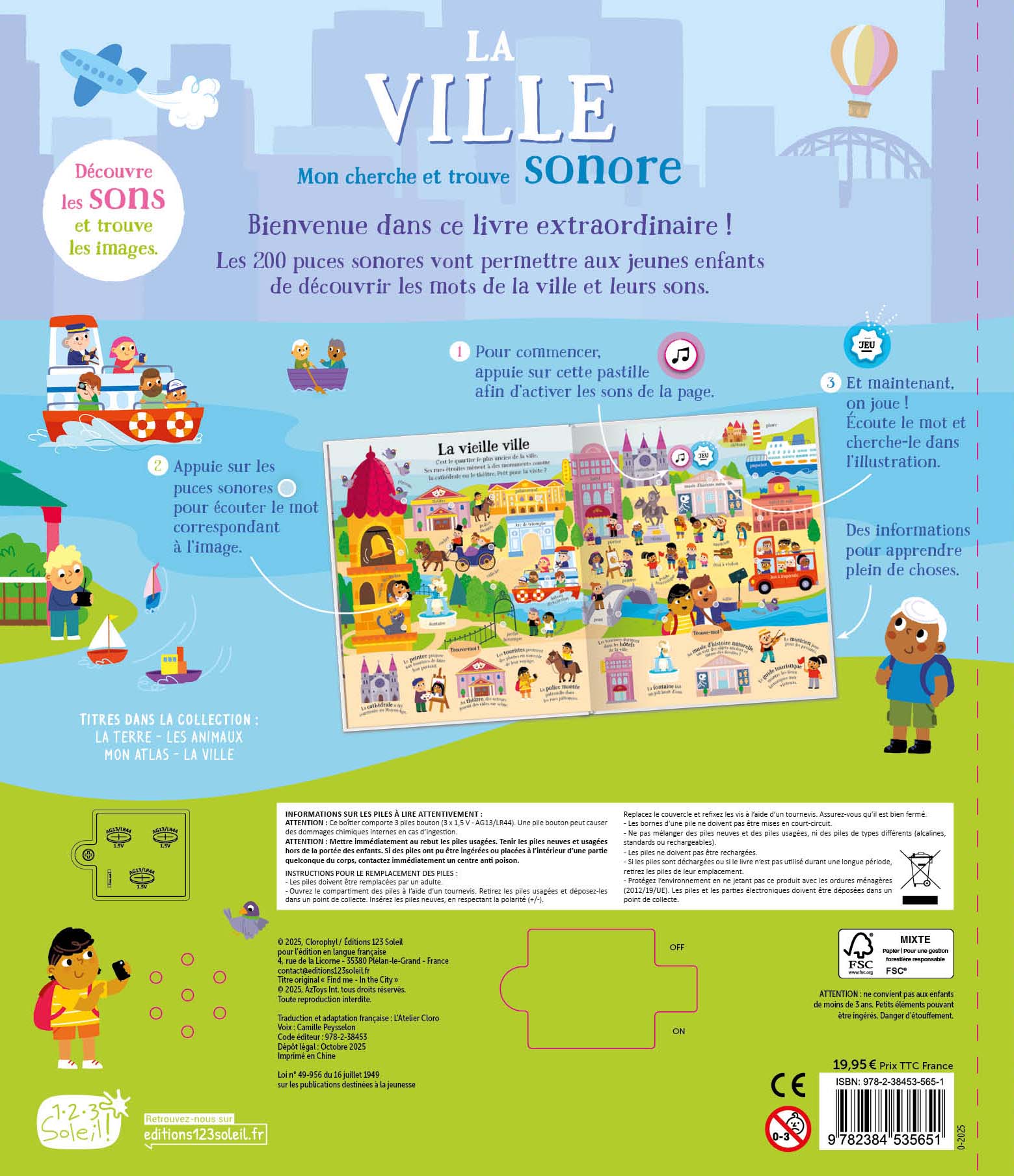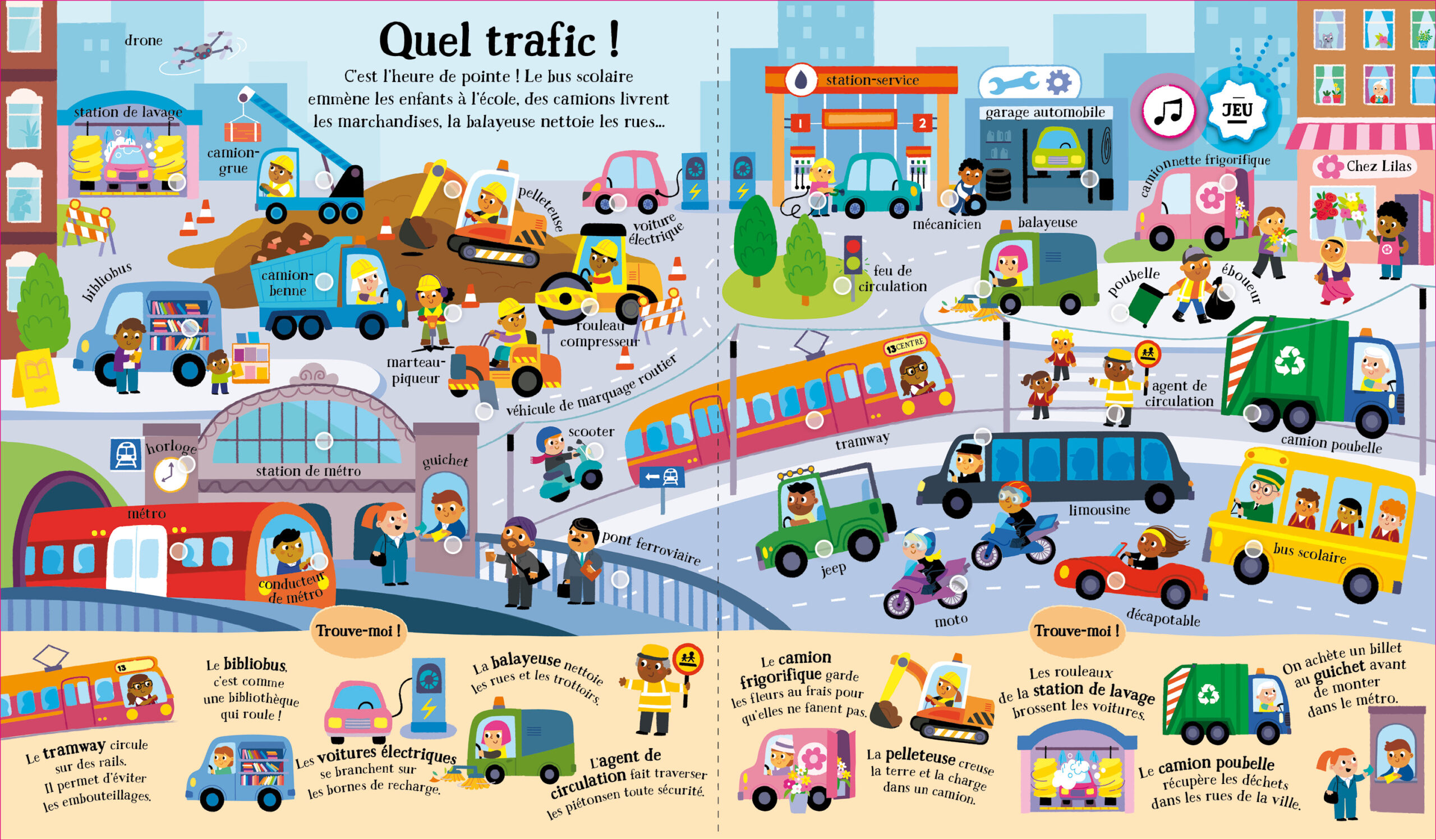Ce livre sonore est extraordinaire ! Ses 200 puces sonores invitent les jeunes enfants à découvrir la ville : le centre-ville et son agitation, le parc et ses animaux, la vielle ville, l’effervescence du chantier, les allées du centre-commercial… Chaque puce sonore propose un mot et son bruit. Un livre grand format pour favoriser l’acquisition de vocabulaire, avec en bonus 70 questions sonores pour observer les illustrations et chercher les réponses. Un beau cadeau pour les petits curieux