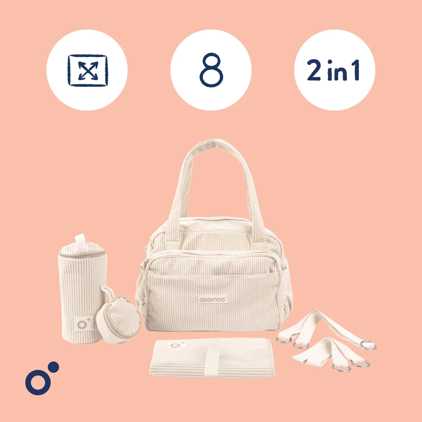 – 8 accessoires inclus : Matelas à langer, pochette isotherme, pochette à sucette, sangle de valise, pochette amovible, porte-clés, attaches pour poussette, bandoulière.
