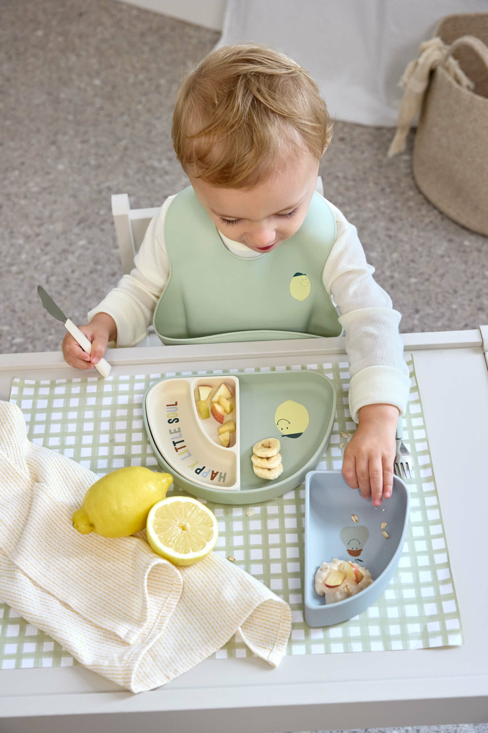 Des fruits rigolos, un grand plaisir ! Le set de vaisselle LÄSSIG en silicone en forme d’arc-en-ciel se divise en trois compartiments séparables offrant de nombreuses possibilités créatives pour le service. Pour mélanger, trier, tremper ou avaler manger à la cuillère : les enfants vont adorer !