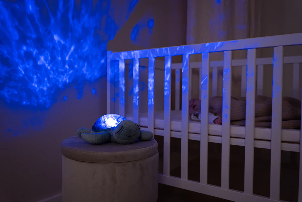 Tranquil Turtle™ Rechargeable est une jolie tortue musicale fabriquée à partir de tissu et de rembourrage polyester 100% recyclé, qui projette sur le plafond de la chambre de l’enfant les vagues de l’océan en mouvement.