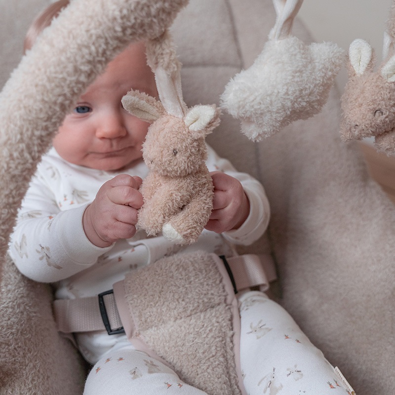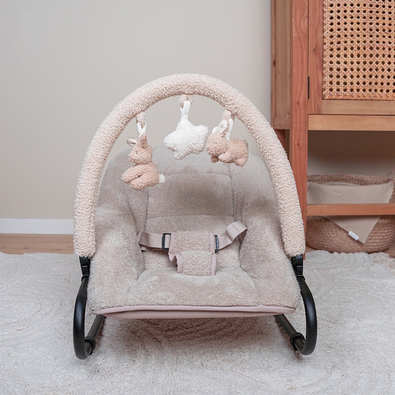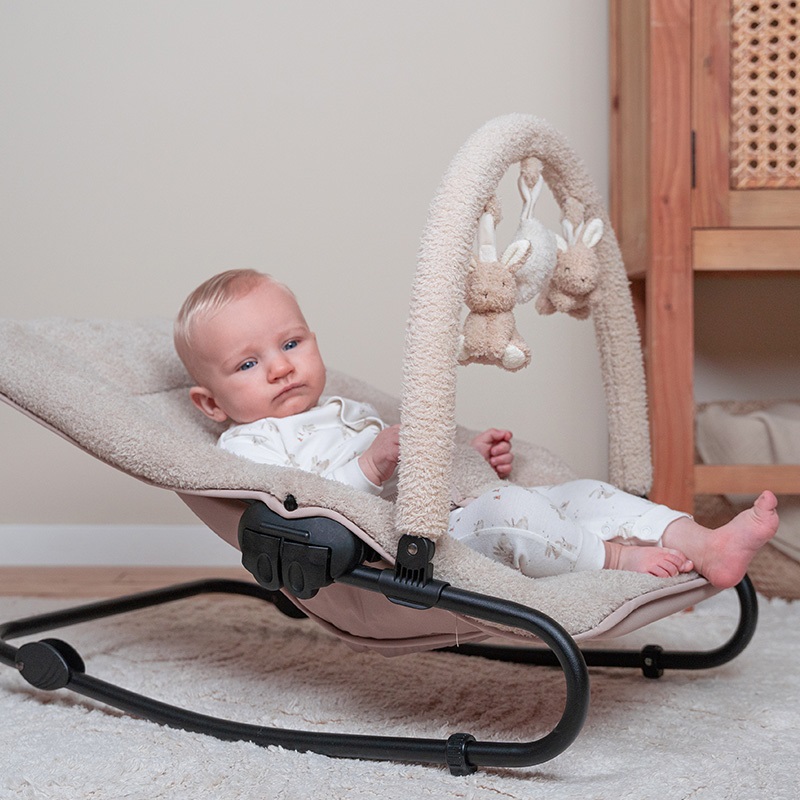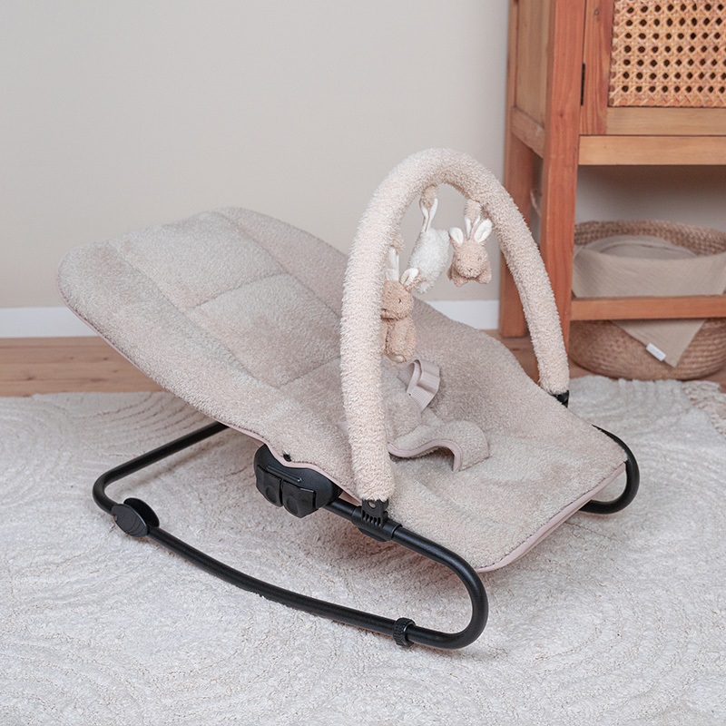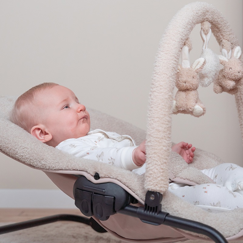 Le transat offre à votre enfant un endroit confortable pour se détendre et jouer. Votre enfant est en sécurité dans la ceinture de sécurité en 3 points et peut jouer pendant des heures avec les jouets sur le support de jeu. Grâce au cadre de swing, la chaise à bascule commence à se tortiller avec un petit mouvement de votre enfant. Le dossier et le repose-pieds sont réglables. La chaise est fournie avec un coussin réduit et une arche de jeu réglable. Il y a un lapin sautant, un nuage et un lapin assis sur l’arc de jeu. Le dossier est réglable à diverses positions et le siège peut être utilisé à la fois en position à bascule et en position fixe. Le transat convient à votre enfant de la naissance à 6 mois (environ 9 kg) jusqu’à ce que votre enfant puisse être à l’aise sur le siège.